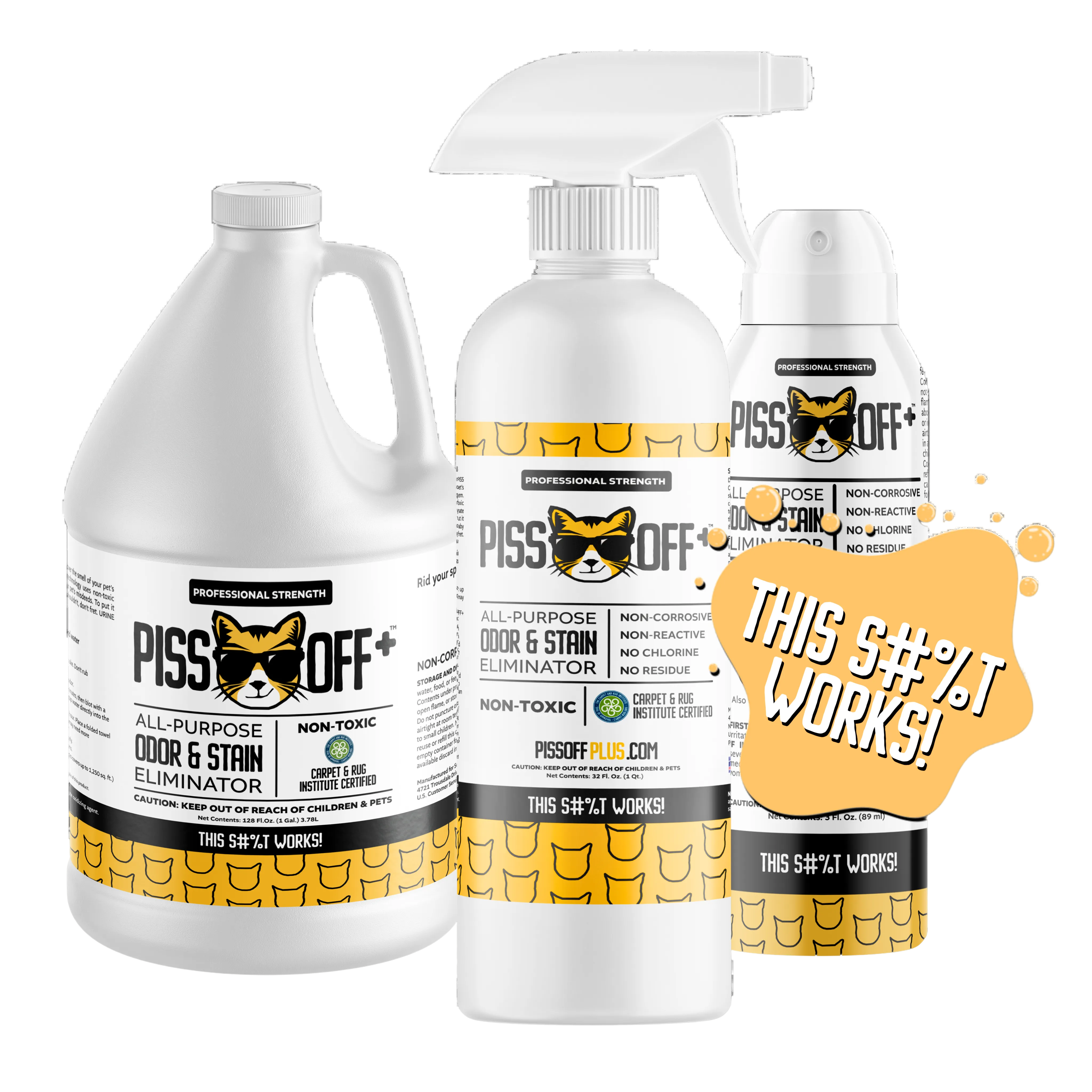 Pet Ddor & Stain Eliminator: This isn’t your grandma’s air freshener! Piss Off + doesn’t just cover the smell of your pet’s crime with fake fragrance, it eliminates them.
