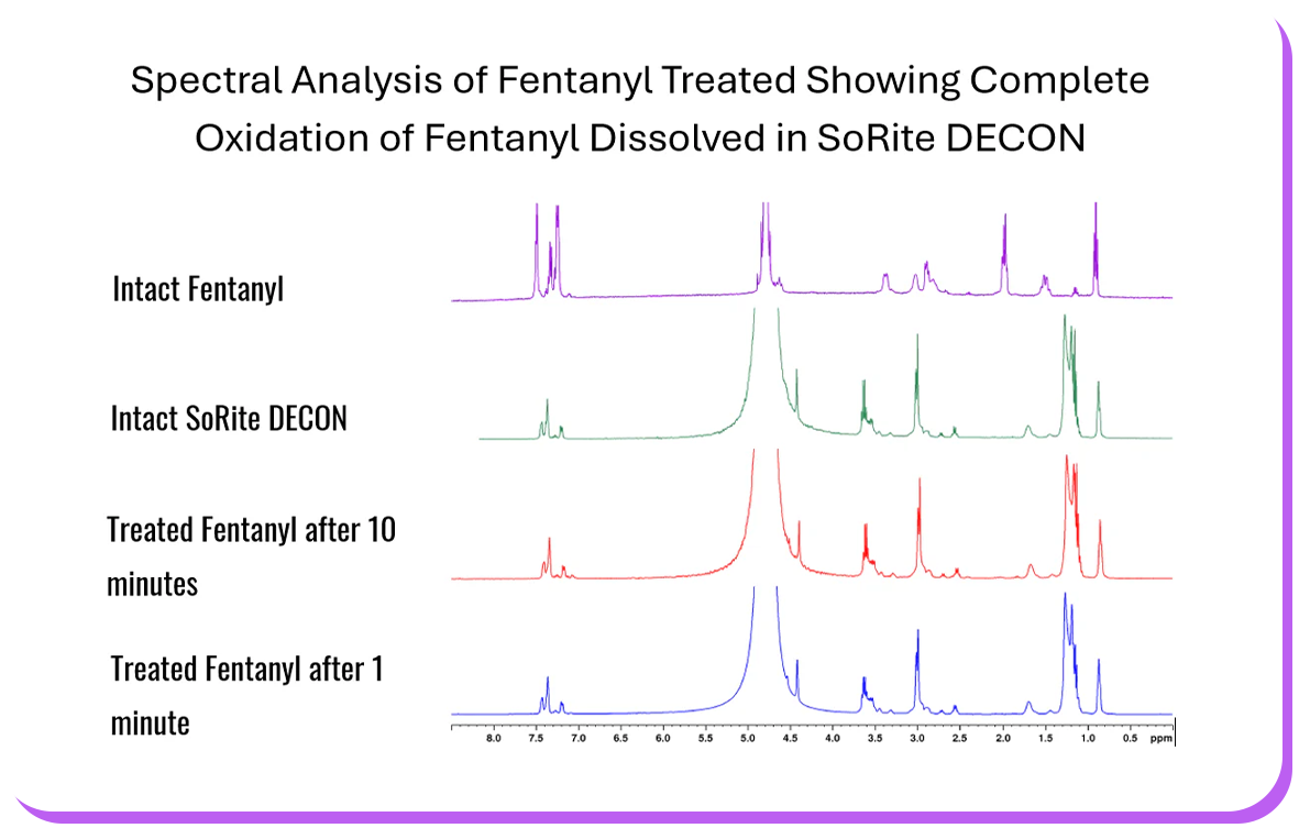As can be seen from spectral analysis, when fentanyl and other narcotics are fully dissolved in SoRite DECON, the SoRite DECON oxidizes the narcotics such that the narcotics are broken down and the molecular level and become inert. After 1 minute and 10 minute incubation times the liquid samples tested substantially mimics the spectral analysis of intact SoRite DECON product. Full H1NMR laboratory testing reports are available in our LEARN MORE section below.