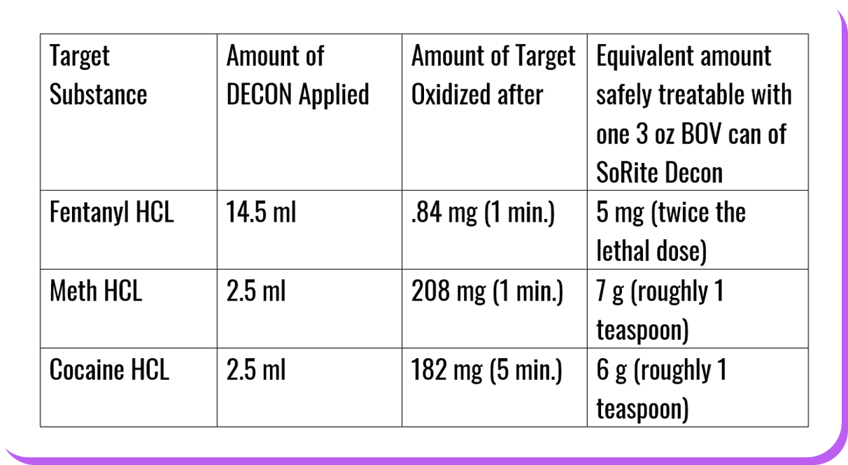 As can be seen from our LCMS testing results, SoRite DECON is not intended for mass disposal of illicit narcotics, but can safely and effectively oxidize smaller amounts of the target narcotics. However, these small amounts, especially with respect to fentanyl, can be very dangerous, and even lethal. Given that most street narcotics encountered in day to day field work are cocaine, meth, etc. laced with fentanyl, SoRite DECON has been proven both through laboratory testing and in the field to help reduce the threat of these commonly encountered combinations of illicit narcotics. Full LCMS laboratory testing reports available in our LEARN MORE section below.