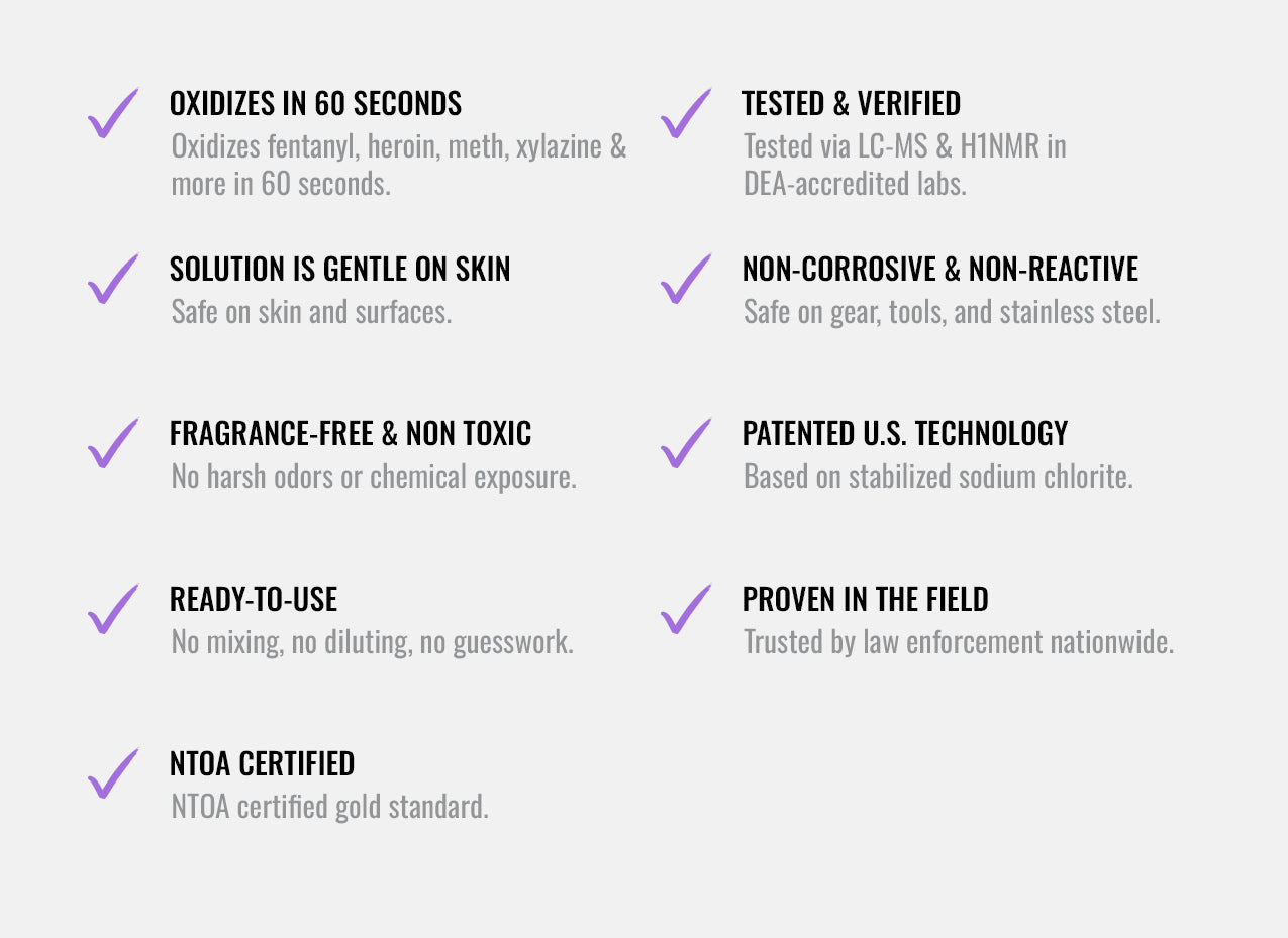 SoRite® DECON is the only proven solution that oxidizes fentanyl, heroin, meth, xylazine, and other narcotics in just 60 seconds—safely, effectively, and without full PPE. This patented, ready-to-use formula harnesses low-toxicity sodium chlorite to oxidize dangerous drug residues without harming skin, gear, or surfaces. Built for law enforcement, first responders, and high-risk environments, SoRite DECON is non-toxic, non-corrosive, fragrance-free, and requires no mixing.